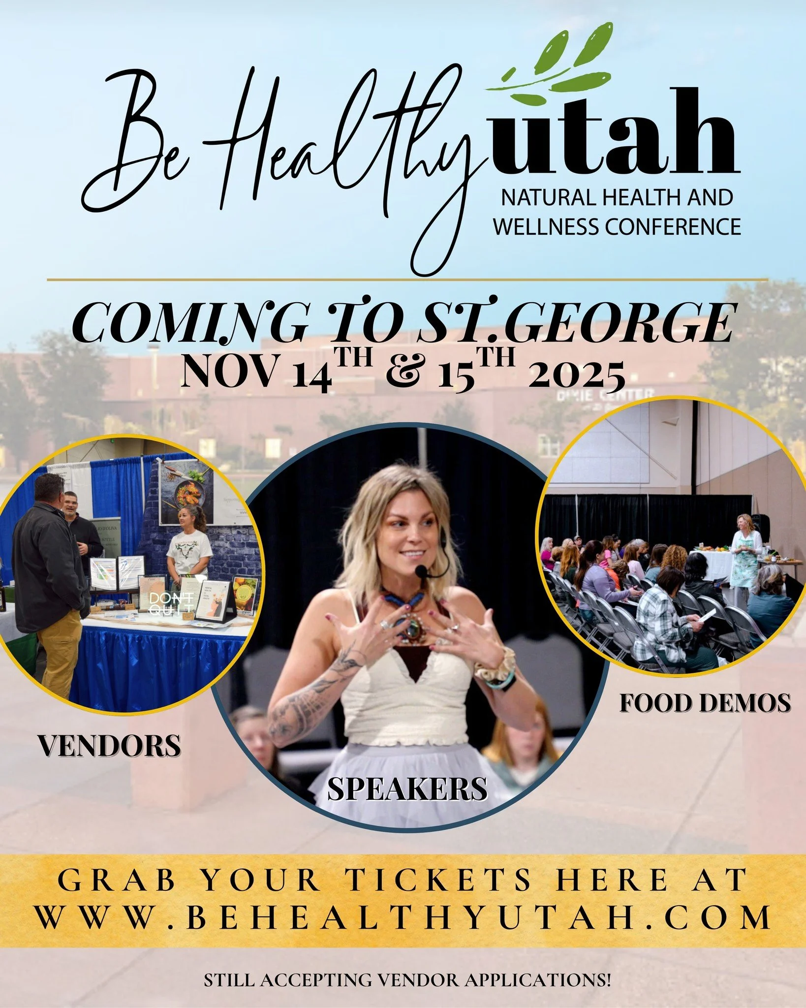 Be Healthy Utah St. George Conference Friday Nov. 14, 2025 1:00 -8:00 pm and Sat. 9am - 6 pm at the Dixie Convention Center in the Ballroom (different than last year). Dr. Shane and Liz Watt host an awesome event! Tamara will be speaking here! Let her know if you’d like a free ticket.