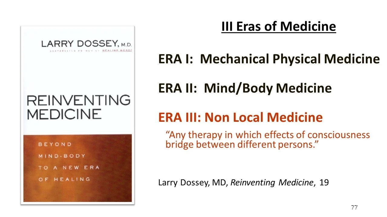 “Just as mind-body medicine– which also aroused profound suspicion– has now gained popular acceptance, so, too, will nonlocal mind become critical to our understanding of healing ourselves and one another. The two main lines of evidence for nonlocal mind are (1) the everyday experiences of millions of people and (2) scientific findings.” (Larry Dossey, Reinventing Medicine, p 8-9)